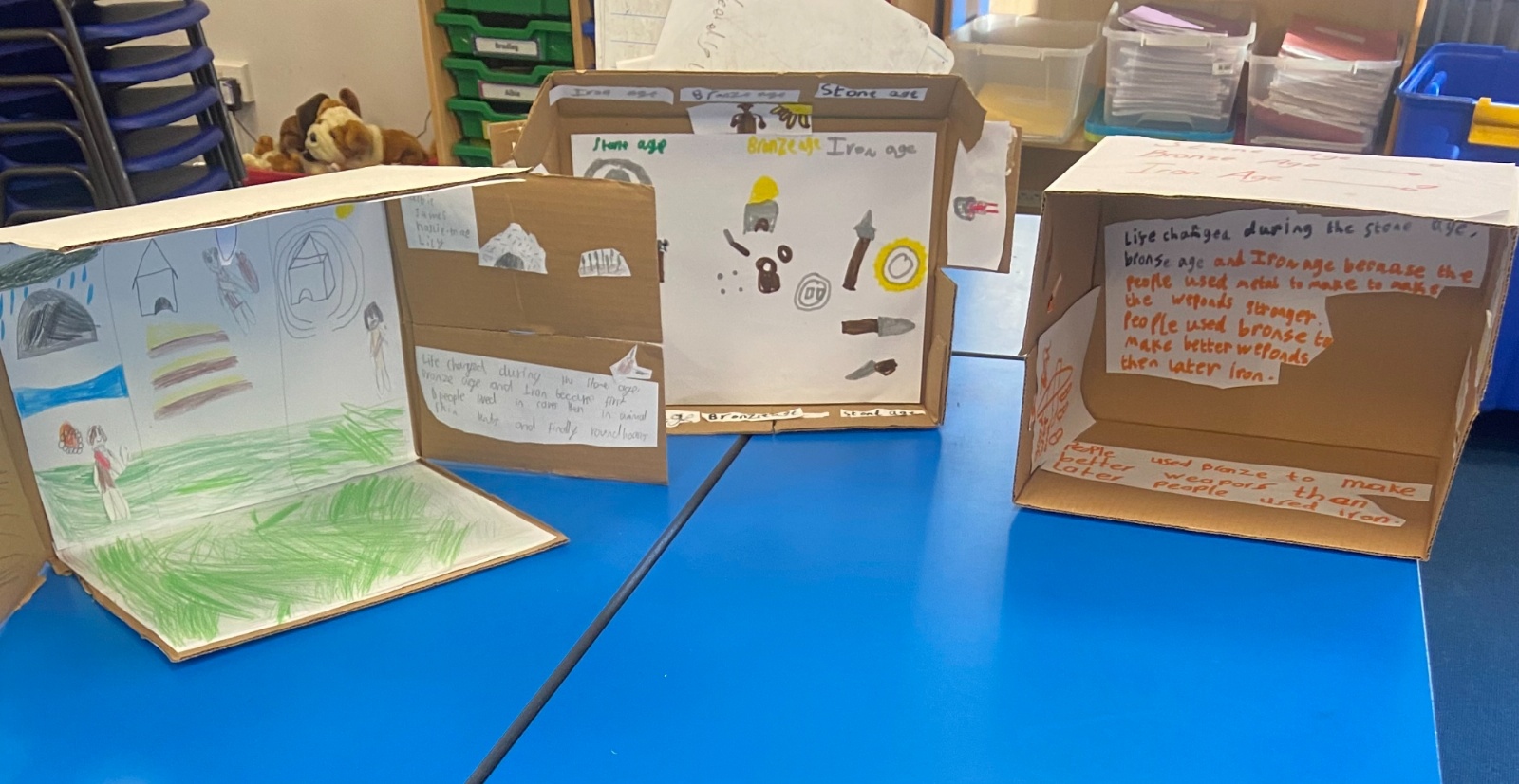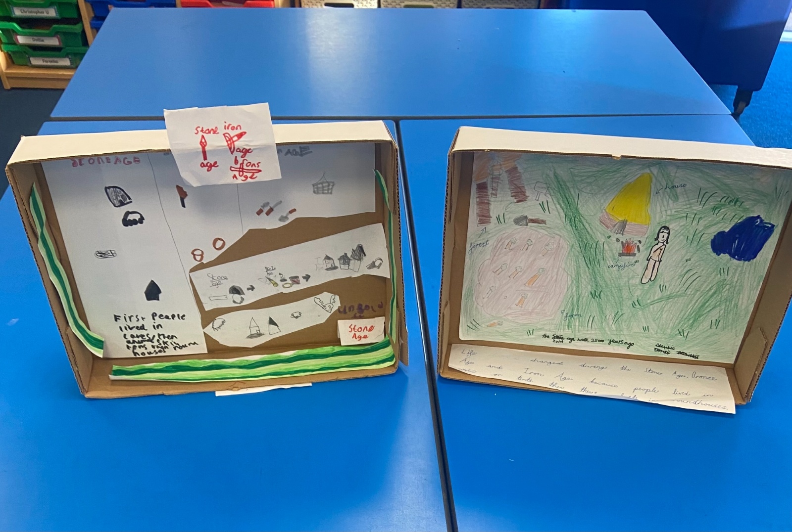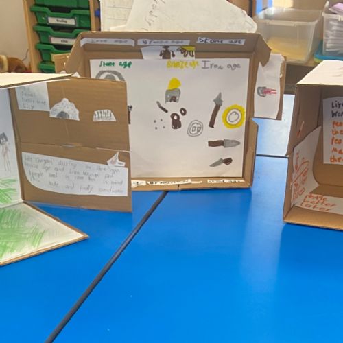 3K have used their amazing historical skills and knowledge to create their own “museum exhibit in a box.” Using everything they’ve learnt about life in the Stone Age, Bronze Age and Iron Age, they worked in groups to draw pictures and add labels to show how life changed over time. We were very impressed by their creativity and historical knowledge and the children can't wait to share this with their year 6 buddies!