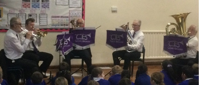 On Wednesday 21st January, we were very lucky to have Cove Brass Brand come to our whole school assembly to share their instruments and perform to us.
